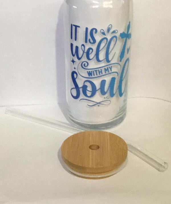 20oz clear religious drinking glass with straw and lid.